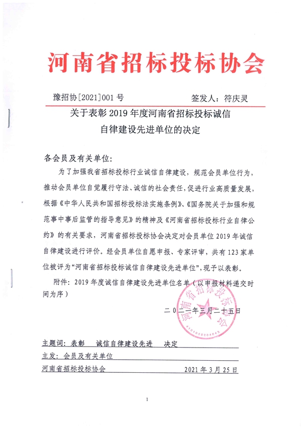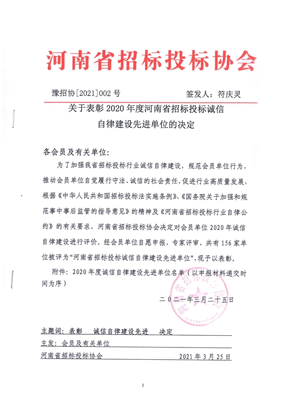 為加強河南省招投標行業誠信自律建設,規范會員單位執業行為,推動相關單位自覺履行守法、誠信的社會責任,促進行業高質量發展,河南省招標投標協會于近日根據《河南省招標投標行業自律公約》的有關要求,對會員單位2019年度、2020年度誠信自律建設進行了評價,并對誠信自律建設先進單位進行了表彰。