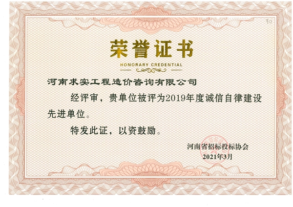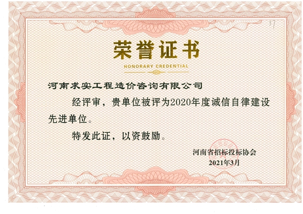 河南求實作為一家綜合性工程咨詢公司,一向依法納稅,誠信經營,并將誠實守信作為公司的核心價值觀時刻教育員工。公司積極踐行誠信自律建設的相關規定,完善公司內部管理制度,認真參加招標投標行業協會舉辦的相關業務培訓,并每年組織公益活動、資助慈善事業,為員工樹立誠信榜樣,起到了良好的教育示范效應。最終經過協會領導和專家的評審,河南求實榮獲2019年度、2020年度誠信自律建設先進單位稱號,為公司的健康發展又添上了濃墨重彩的一筆。