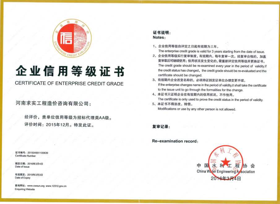 公司榮獲中國水利工程協會頒發的AA級企業信用等級證書